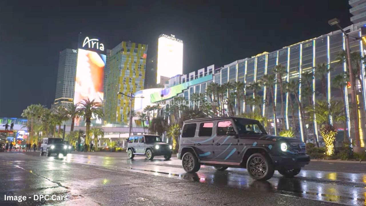 Mercedes has showcased the 360° tank turn feature of its new Electric G-Class in multiple videos posted earlier. The company has chosen to call this feature the ‘G’ turn. Taking it a step further, 4 EQG prototypes can be seen performing synchronized 360° tank turns at the Las Vegas Strip. The spectacular show highlights the superior technological prowess of electric cars in comparison to ICE vehicles.